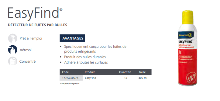 Détecteur de fuites par bulles. EasyFind est un détecteur de fuites moussant, qui teste à la bulle. Vendu en aérosol, il est spécialement conçu pour repérer les fuites de fluides frigorigènes. Les détecteurs de fuites de gaz ne conviennent pas aux fluides frigorigènes, car, n’ayant pas la même viscosité, ils n’adhèrent pas bien aux surfaces. Ils se décollent trop vite de la tuyauterie et ne donnent pas le temps de repérer la fuite.
