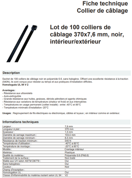 Retrouvez ici les différentes documentations et fiches techniques pour Collier de serrage Rilsan pour installation à usage UV exterieur - interieur noir (100pcs).
